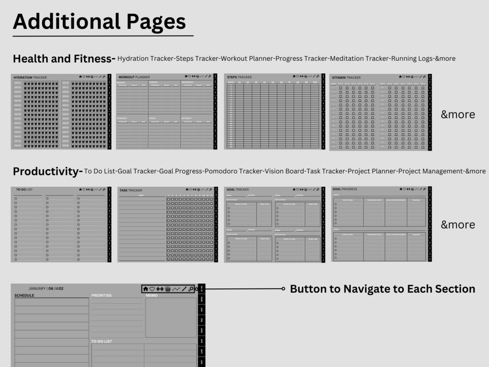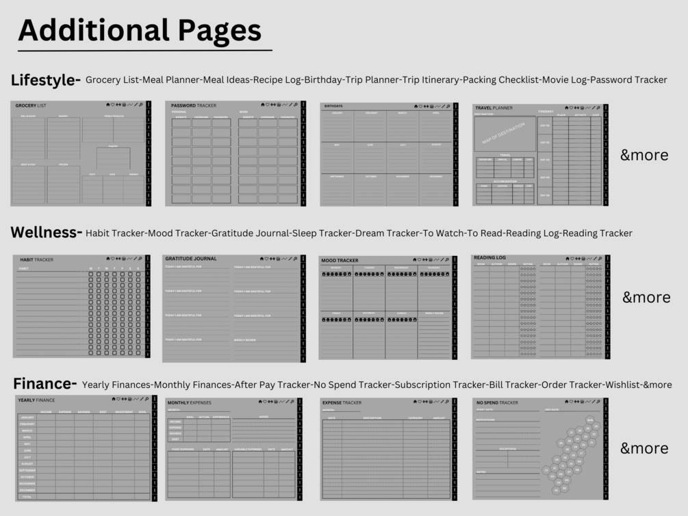 ✔Meal Planning page, Meal Ideas page, Grocery List, Habit Tracker, Mood Tracker, Gratitude Journal, To Do List, Challenge Tracker, Yearly Finances, Monthly Finances, Bill Tracker, Order Tracker, Hydration Tracker, Steps Tracker, Progress Tracker, And MANY more! (shown in product photos)
