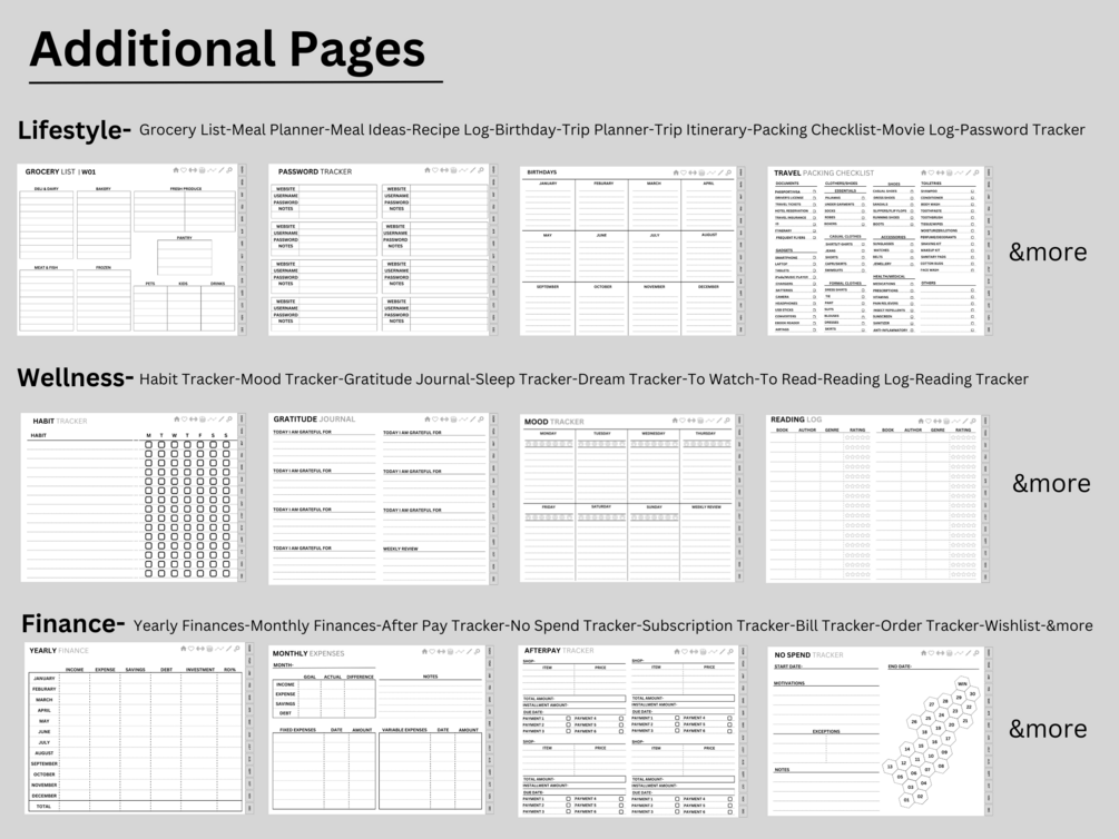 ✔Meal Planning page, Meal Ideas page, Grocery List, Habit Tracker, Mood Tracker, Gratitude Journal, To Do List, Challenge Tracker, Yearly Finances, Monthly Finances, Bill Tracker, Order Tracker, Hydration Tracker, Steps Tracker, Progress Tracker, And MANY more! (shown in product photos)